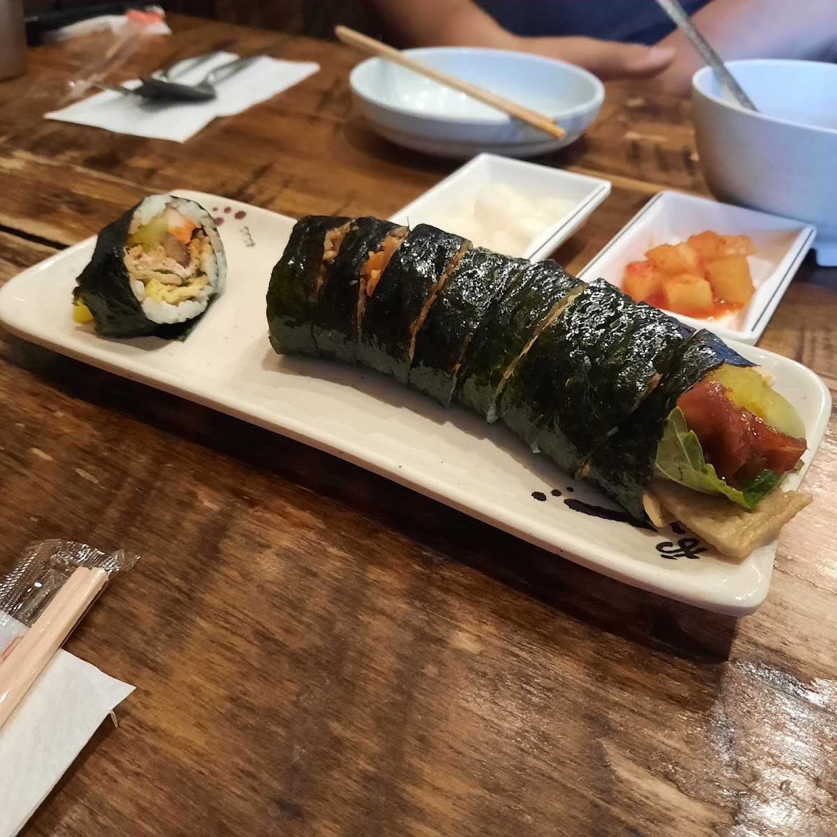 Kimbap is a popular Korean dish, and Poetree Cafe's spicy squid kimbap brings a modern twist to this beloved meal. The dish features rice wrapped in seaweed, filled with spicy squid and other fresh ingredients, offering a delightful combination of flavors in every bite.