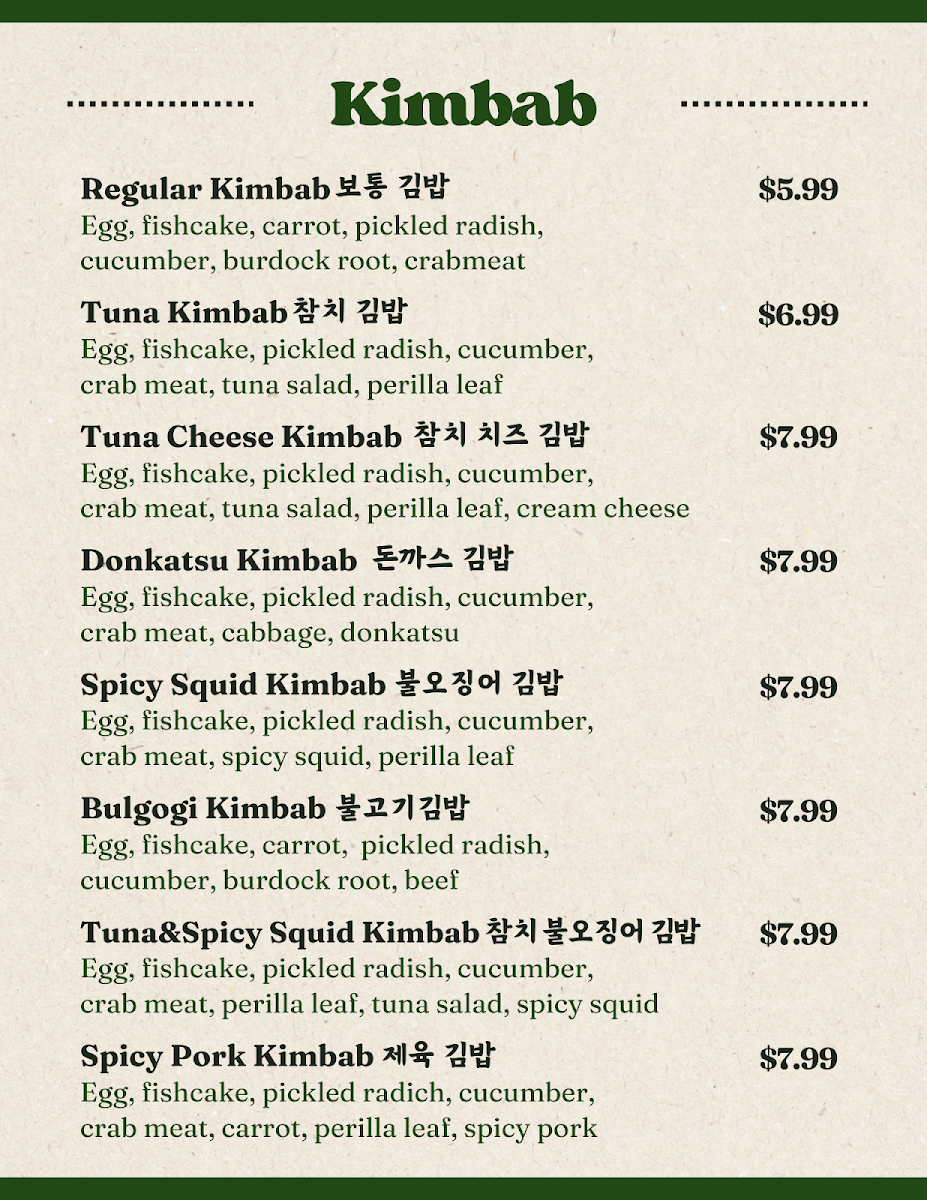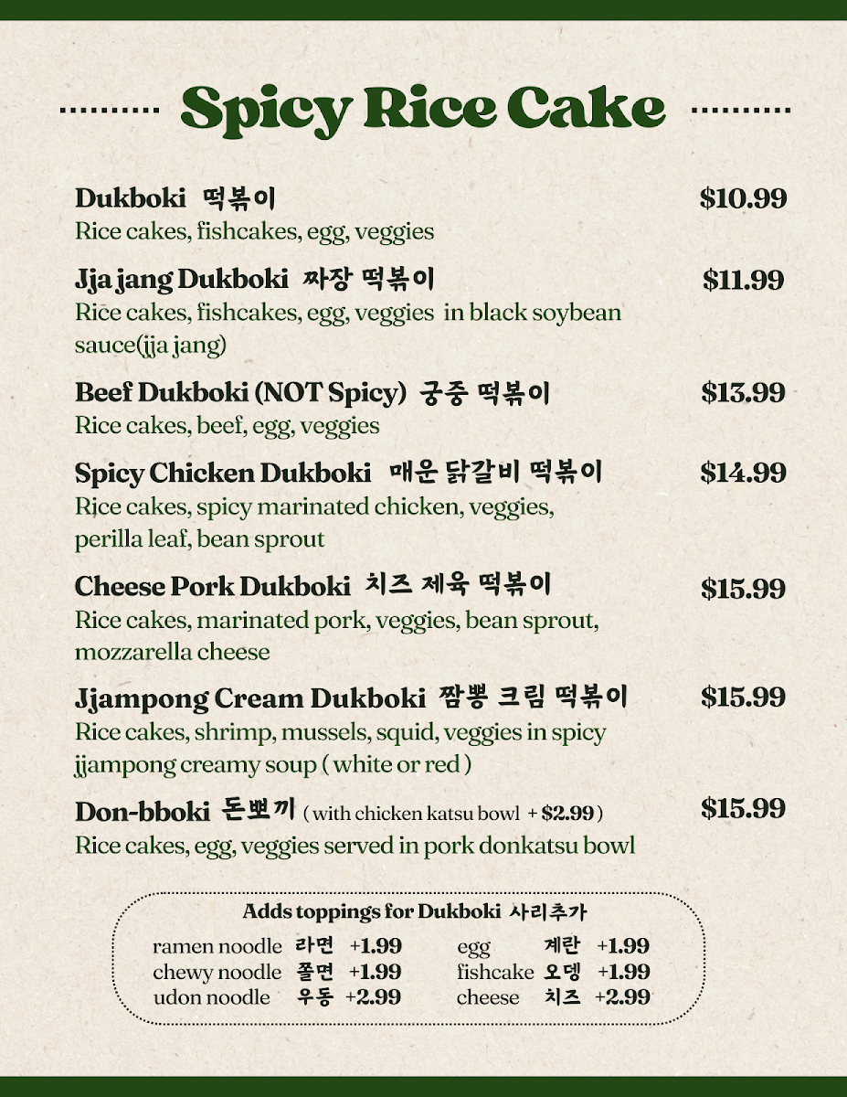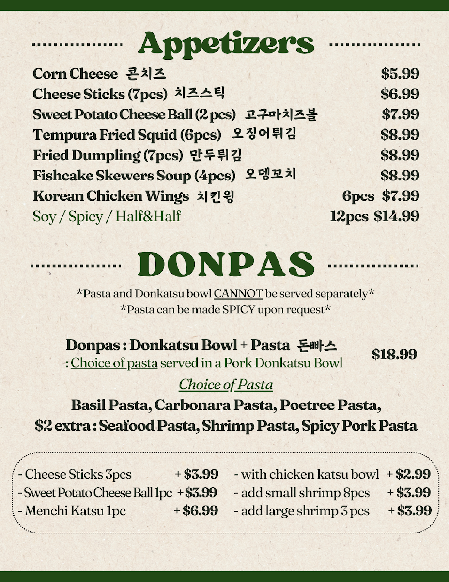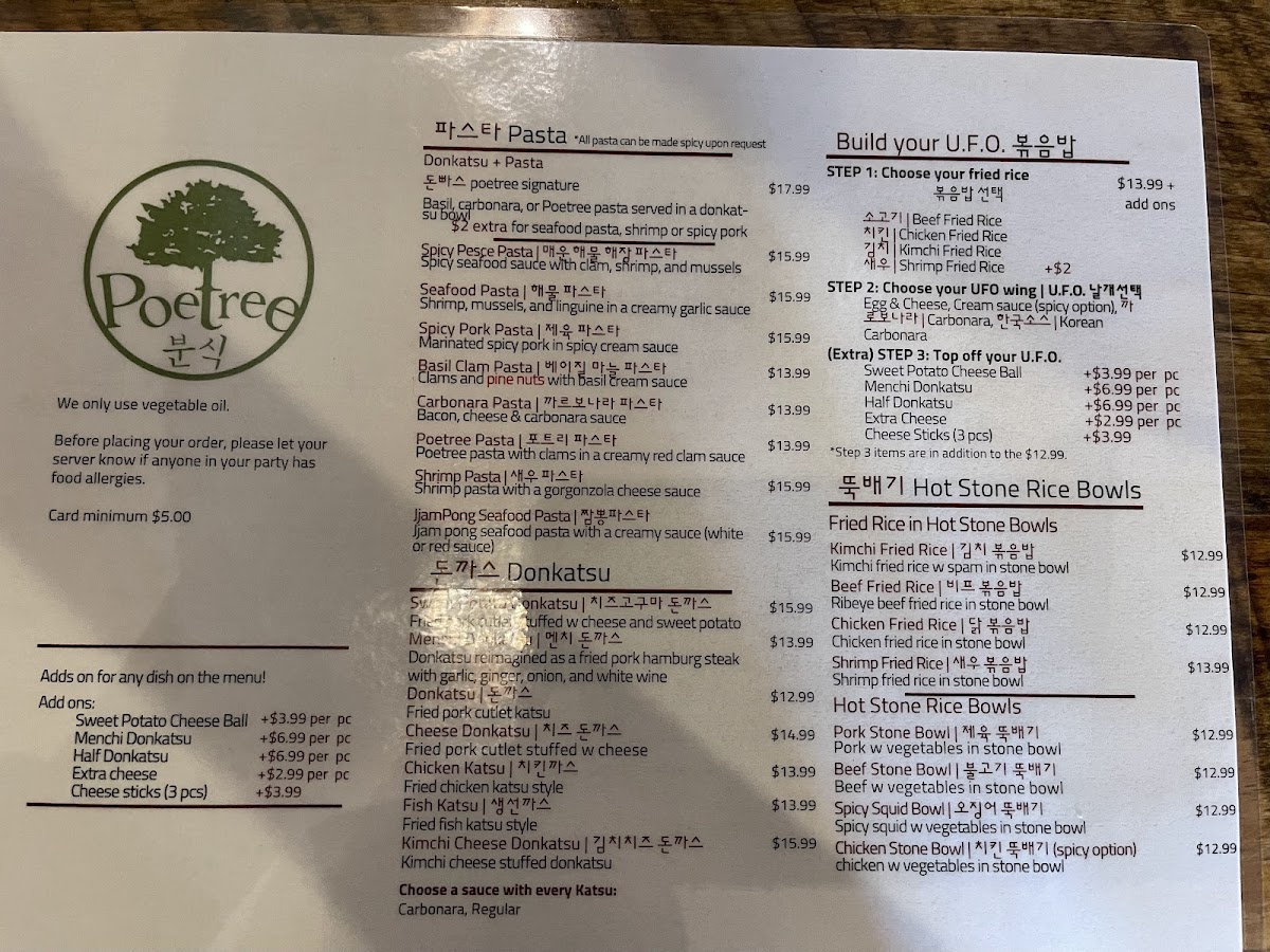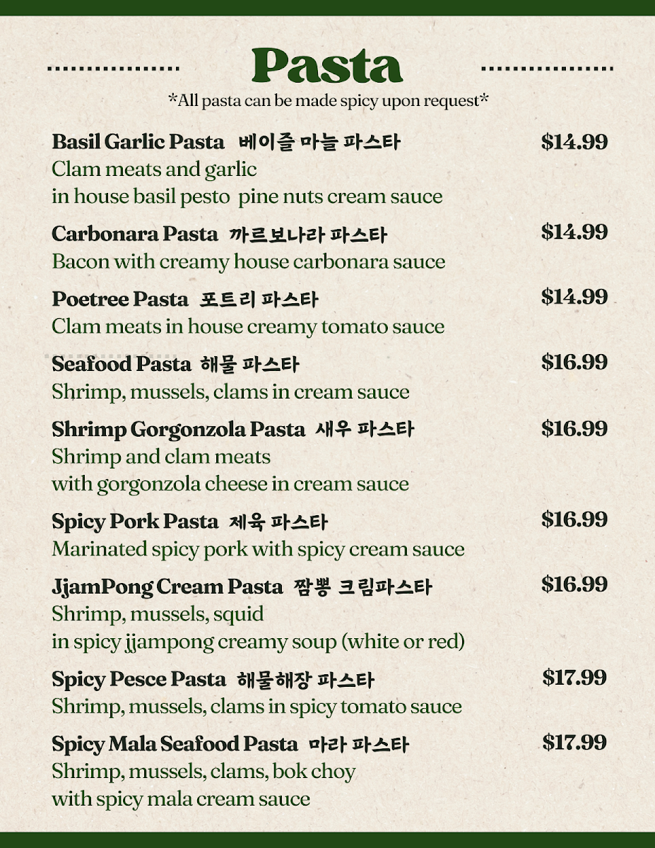 Poetree Cafe, nestled in the heart of Suwanee, where delicious meets delightful! Our menu is a culinary journey featuring a tantalizing array of dishes that promise to ignite your taste buds. Start your adventure with our signature Menchi Katsu, perfectly finished with eggs and served on a bed of rice, or dive into the UFO Fried Rice, a playful twist packed with flavor. For those seeking something spicy, the Spicy Chicken Skillet and Spicy Seafood Linguine with Mussels will hit the spot. Don't miss out on our unique Spicy Squid Kimbab and comforting Donkatsu Pasta. Pair your meal with a warm bowl of Oden Kkochi (fishcake skewers soup) or the refreshing Jjol Myun for a delightful balance. Each plate is crafted with care to create memorable dining experiences. Visit us at 45 Old Peachtree Rd NW and explore the Poetree Cafe menu that invites you to taste the extraordinary!